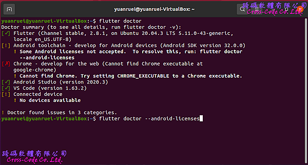 4-3. 執行flutter doctor 確認相關套件是否安裝完成,若否則執行flutter doctor --android-licenses