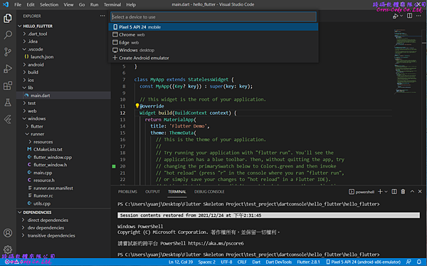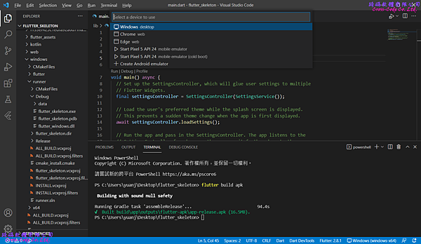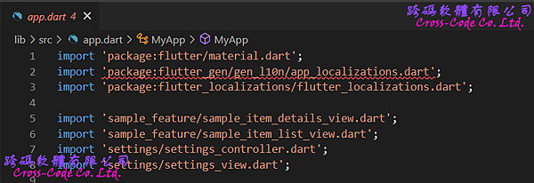 主要存放開發程式碼的目錄,main.dart 中的 main 函式為啟動程式的入口函式,而此範例程式使用非同步的方法載入主題(Thmem)的資料,因此在main 函式後加入 async 關鍵字。