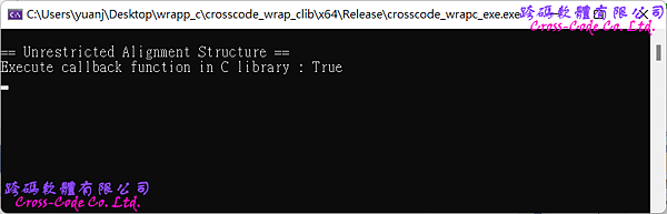 wprintf(L"\nCopy structure data in C library : %d\n", copyDataOfUnrestrictedAlignmentStructWithCallbackProc(hinstLib, sUnrestrictedAlignmentStruct, getUnrestrictedAlignmentStructProc));